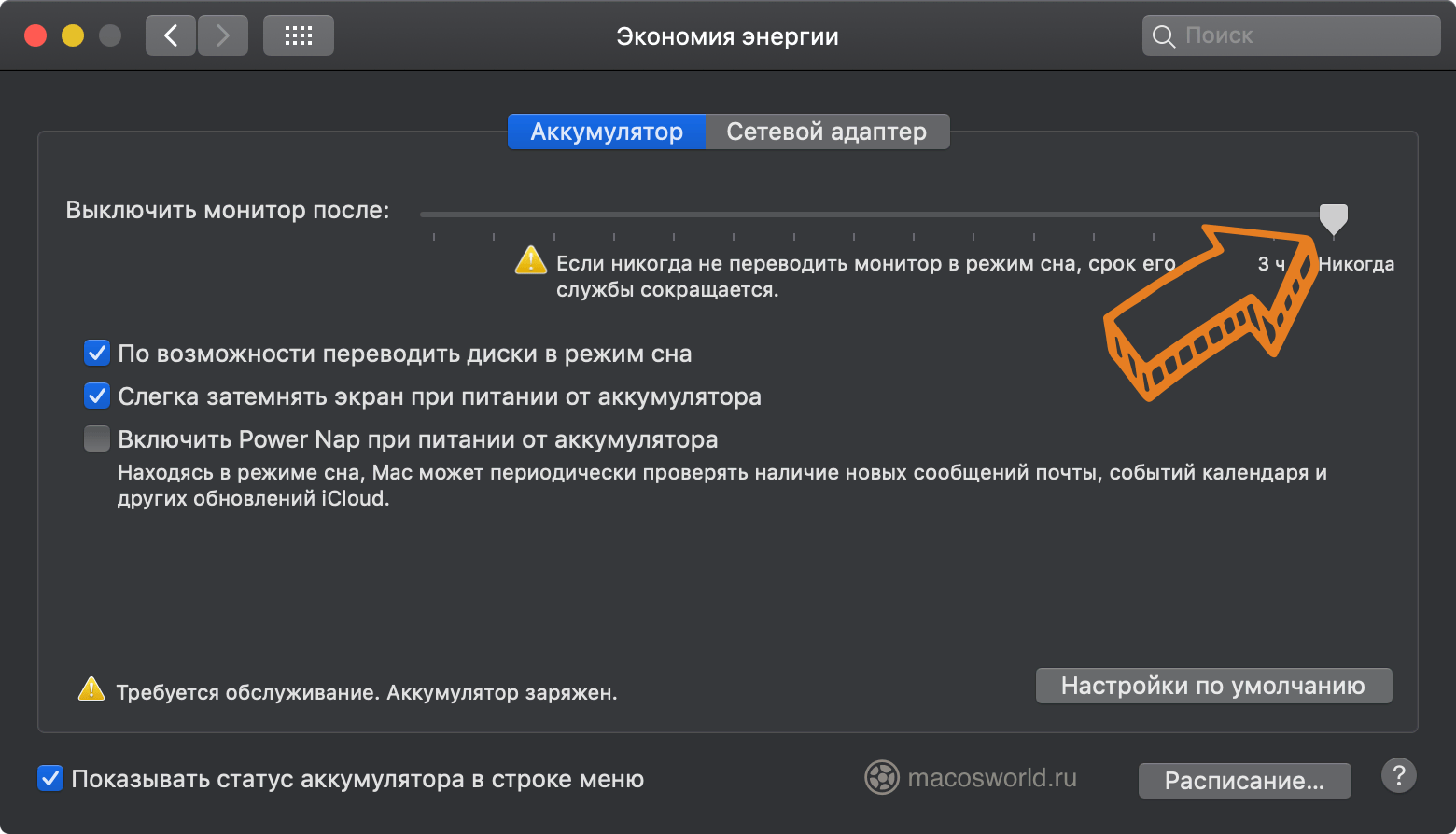 ▸ Системные настройки… ▸ Экономия энергии ▸ Аккумулятор