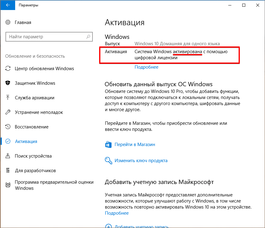 Читаем: «Система Windows активирована с помощью цифровой лицензии». Сообщение может быть и другим, ведь активировать систему можно и с помощью ключа. Неважен способ активации, главное здесь, то, что система АКТИВИРОВАНА.