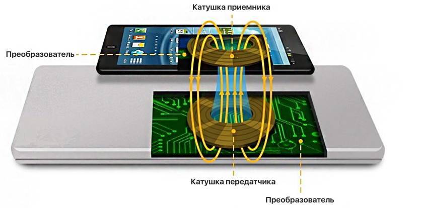 Внутри смартфона или другого гаджета помещена точно такая же магнитная катушка. При помещении обоих приборов рядом возникает индукция магнитного поля катушки, которая увеличивает воздействие на перемещение заряда (тока). Ток передаётся по выпрямителю на батарею, тем самым происходит зарядка смартфона.