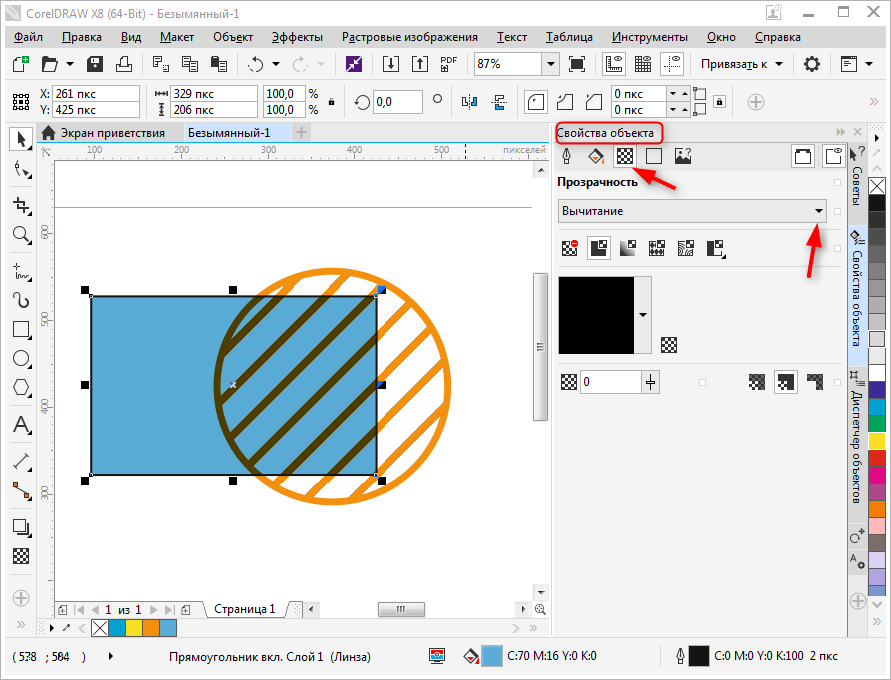Скажем сразу, что рассматривать мы будем вариант, когда оба исходных изображения уже готовы и частично наложены друг на друга. В качестве примера мы взяли окружность, которая была заполнена полосатой заливкой а так же голубой прямоугольник.