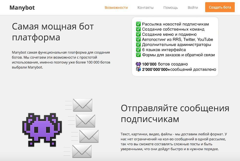 Поскольку роботы являются программами, то их создание тоже можно доверить программам. В Интернете легко найти множество автоматических сервисов по созданию ботов для Телеграм. Это, например, Manybot, Botobot, Botmother, EBOT.ONE, Info-bot и множество других. Среди них есть универсальные, а можно найти конструктор ботов для определённого вида деятельности.