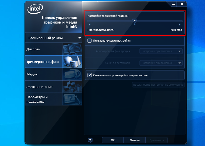 Особняком стоит раздел «Трехмерная графика». Он включает дополнительную настройку, позволяющую подбирать лучший с точки зрения пользователя баланс между производительностью и отображением трехмерной графики.