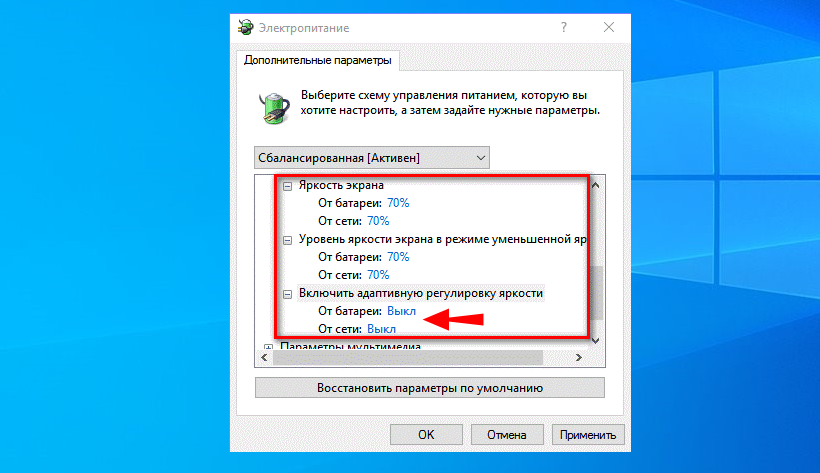 Такой же отдельной настройкой является «Адаптивная яркость», автоматически изменяющая яркость экрана в зависимости от освещения в помещении. Если вас это не устраивает, можете ее отключить. Для этого командой в окошке «Выполнить» откройте дополнительные параметры электропитания, разверните «Экран» → «Включить адаптивную регулировку яркости» и отключите ее.