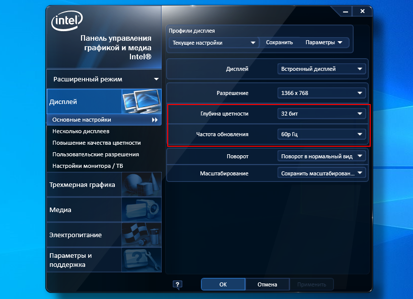 - Глубина цветности — количество используемых цветовых оттенков. По умолчанию обычно выставляется максимально поддерживаемое дисплеем.