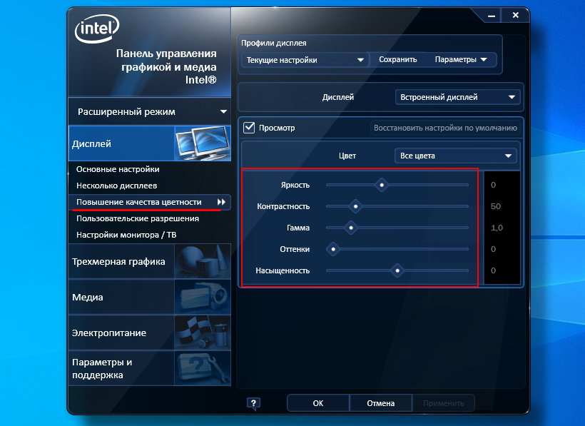 Еще больше возможностей в плане настройки экрана ноутбука предоставляет панель управления графикой Intel. Если вы переключитесь в раздел «Дисплей» → «Основные настройки», а затем и в «Повышение качества цветности», то обнаружите для себя ряд настроек, которых нет в приложении «Параметры». К ним относятся: