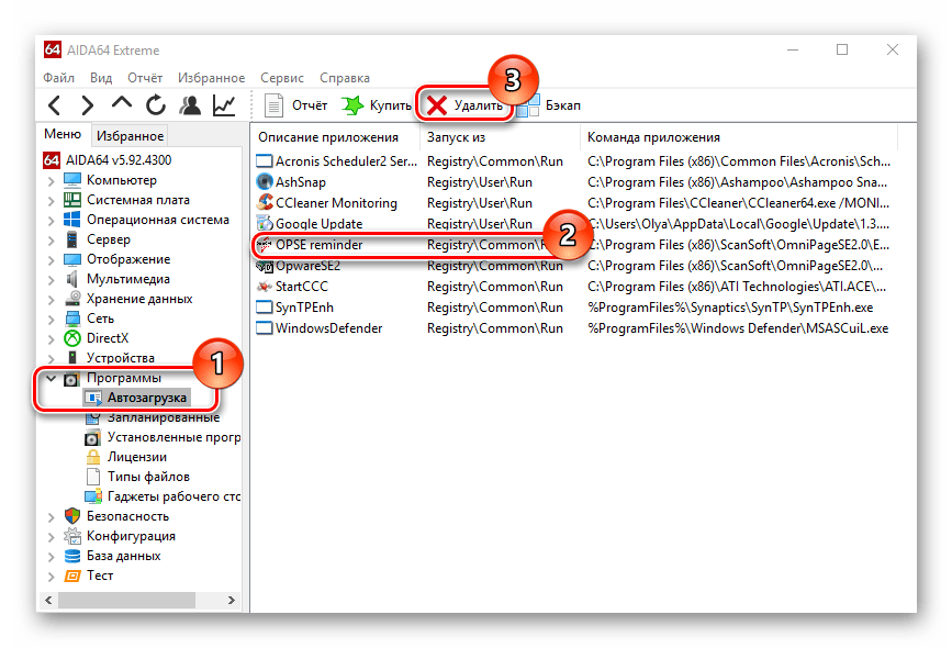 - После построения списка приложений в автозагрузке щелкните по элементу, который нужно открепить из автозагрузки, и нажмите кнопку «Удалить» в верхней части окна программы AIDA64.