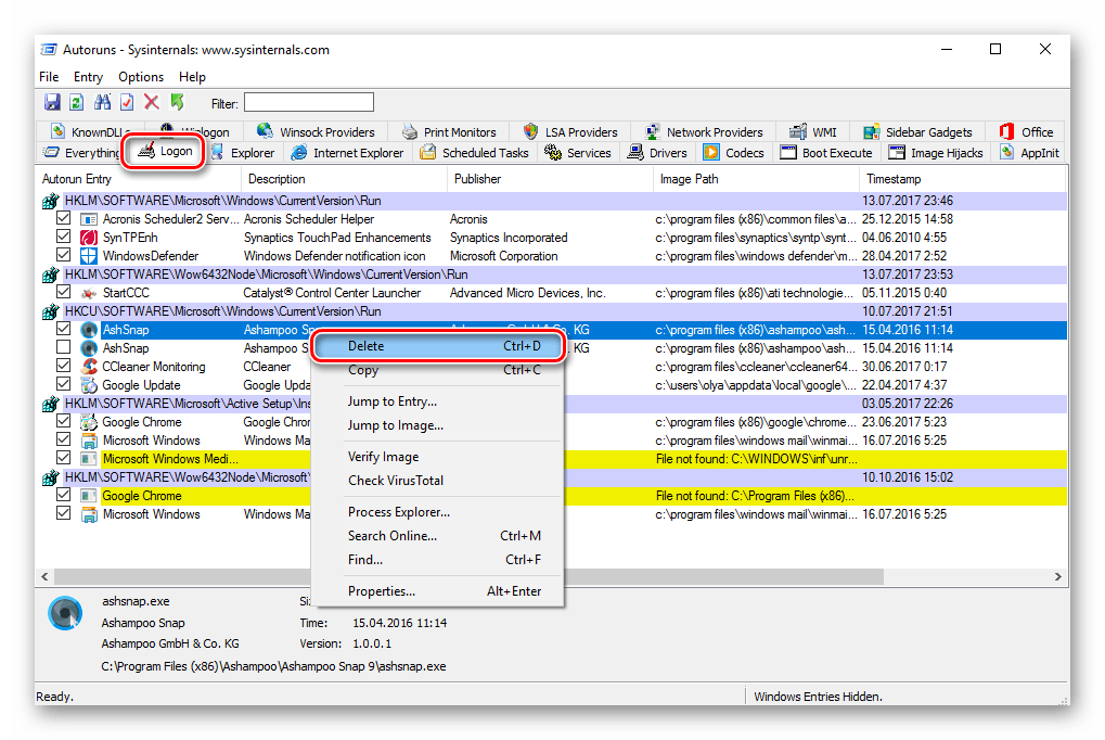 Autoruns — это довольно неплохая утилита, представленная Microsoft Sysinternals. В ее арсенале тоже имеется функция, позволяющая удалить ПО из автозагрузки. Главными преимуществами по отношению к другим программам является свободная лицензия и отсутствие необходимости инсталляции. Autoruns имеет и свои минусы в виде запутанного англоязычного интерфейса. Но все же, для тех, кто выбрал этот вариант, распишем последовательность действий для изъятия приложений.
