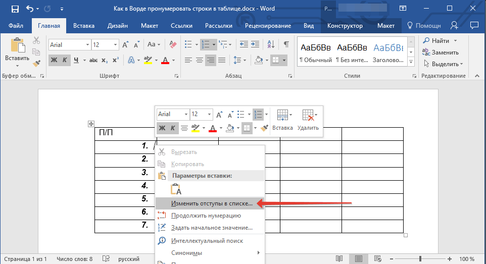 1. Кликните правой кнопкой мышки в ячейке с цифрой и выберите пункт “Изменить отступы в списке”: