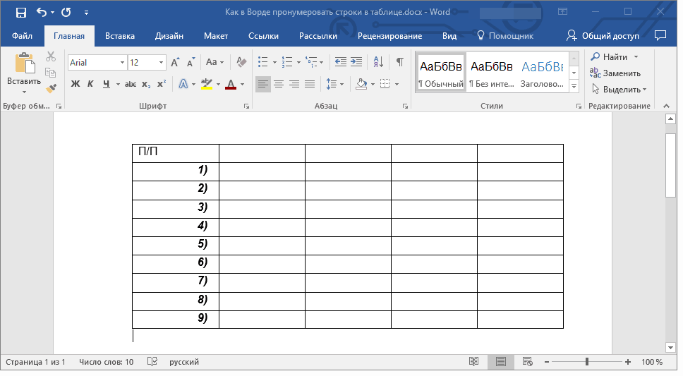 В Ворде сделать это можно и вручную – просто в начале каждой проставьте порядковый номер. Точно так же и с таблицей – создайте отдельный столбец слева и проставьте номера. Но вот если в текст будут вноситься поправки, или придется добавить или удалить строки, тогда нумерация нарушится, и придется все исправлять.
