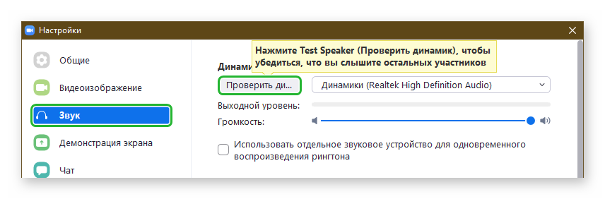 Для проверки без конференции нужно отключить функцию автоматического подключения. До конференции можно проверить звук в зуме. После присоединения нажимаем кнопку «Проверить динамик и микрофон». На экране появится всплывающее окно с предложением проверки. Должен прозвучать рингтон. Если этого не произошло, то используйте другие динамики.