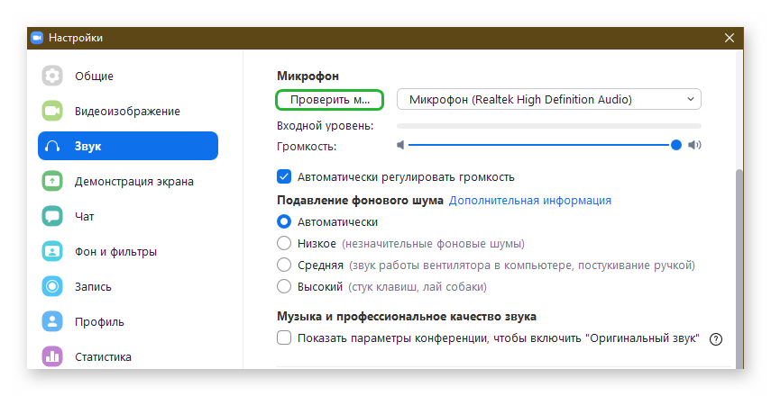 Включение и настройка микрофона в Zoom на компьютере/ноутбуке