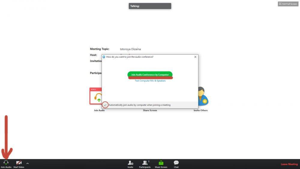 - В предложенном окне нажать «Join Audio» и выставить отметку напротив «Automatically Join Audio» – в этом случае вы сразу обеспечиваете себе просмотр со звуком.