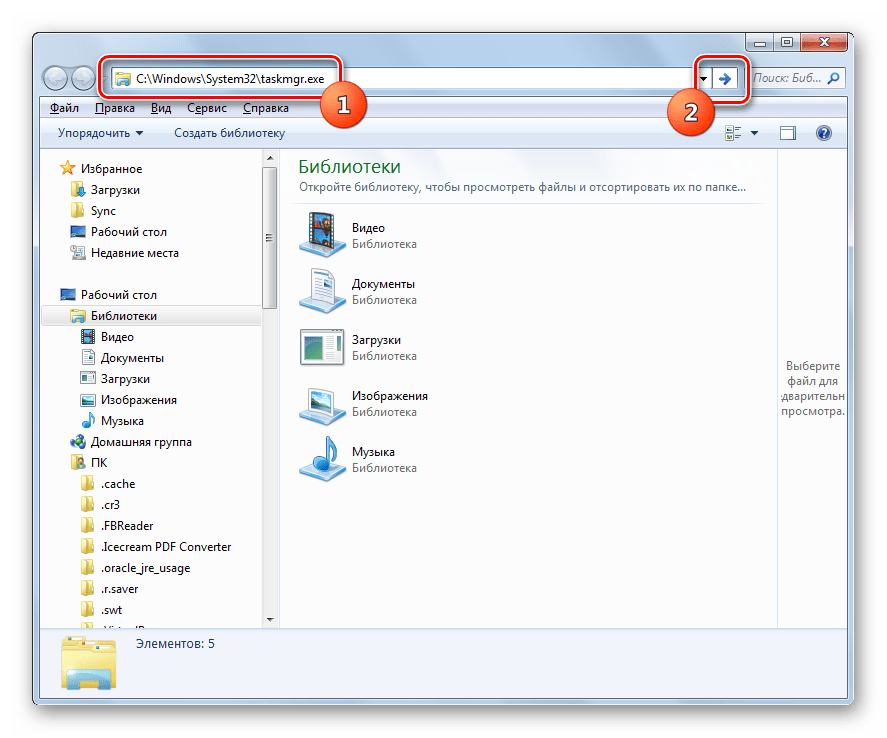 Выполняется переход в системную папку, в которой находится файл taskmgr.exe. Находим и дважды щелкаем по нему.