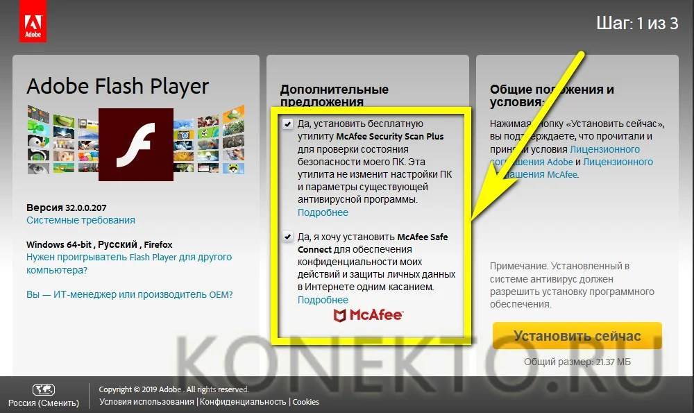 Снять обе галочки в чекбоксах, размещённых в средней части нового окна – иначе впоследствии придётся удалять с компьютера или ноутбука не самое нужное приложение от McAfee.