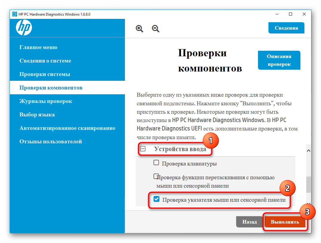 Разверните категорию «Устройства ввода» и поставьте галочку напротив пункта «Проверка указателя мыши или сенсорной панели», затем кликните на «Выполнить».