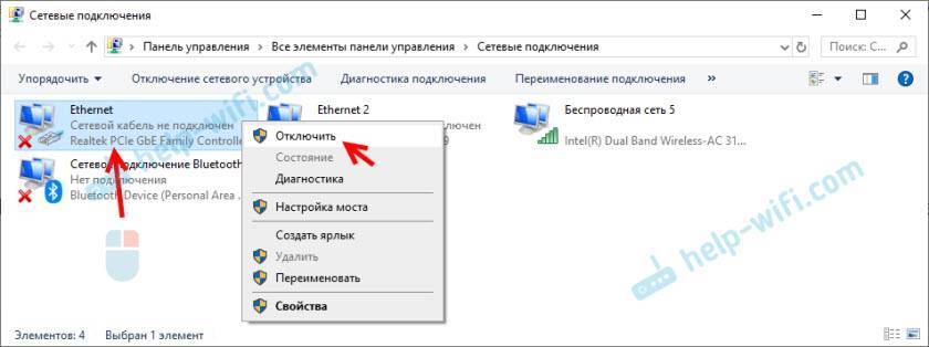 Так же включить/отключить сетевой адаптер можно в окне “Сетевые подключения” (для запуска нажимаем Win+R и выполняем команду ncpa.cpl). В Windows 10 подключение называется “Ethernet”. В Windows 7 – “Подключение по локальной сети”.
