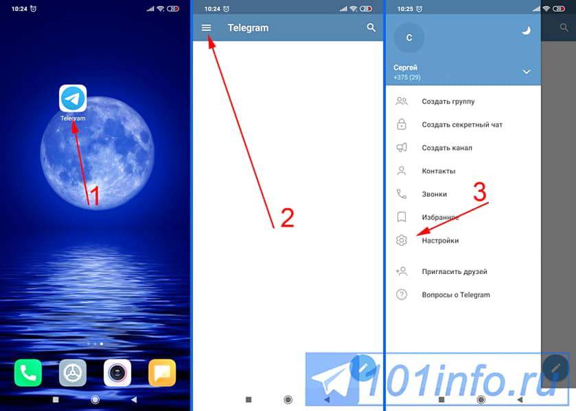 - Откройте Телеграмм и нажмите на три полоски в левом верхнем углу;