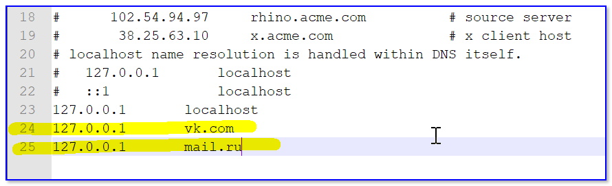 Так вот, если его открыть в блокноте, ввести строки (как в моем примере ниже ) и сохранить — то браузеры перестанут открывать странички с этих ресурсов (в мое случае: vk.com, mail.ru).