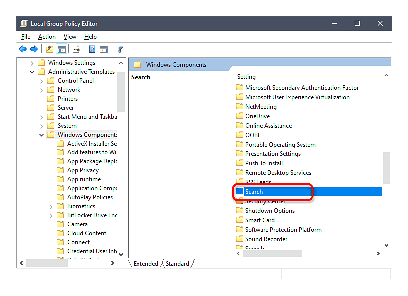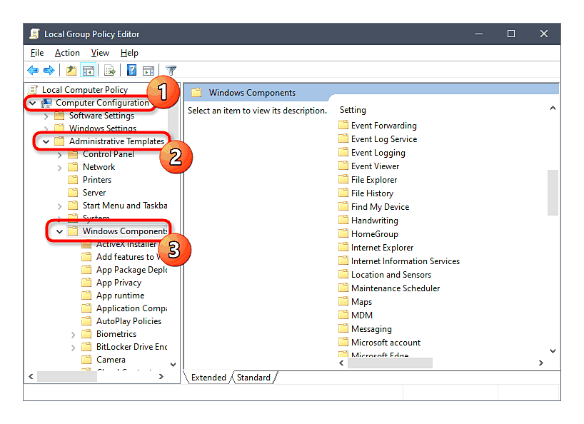 - далее перейти к «Правилам локального компьютера», а затем к «Конфигурации компьютера», «Административные шаблоны», «Компоненты Windows» и «Найти».