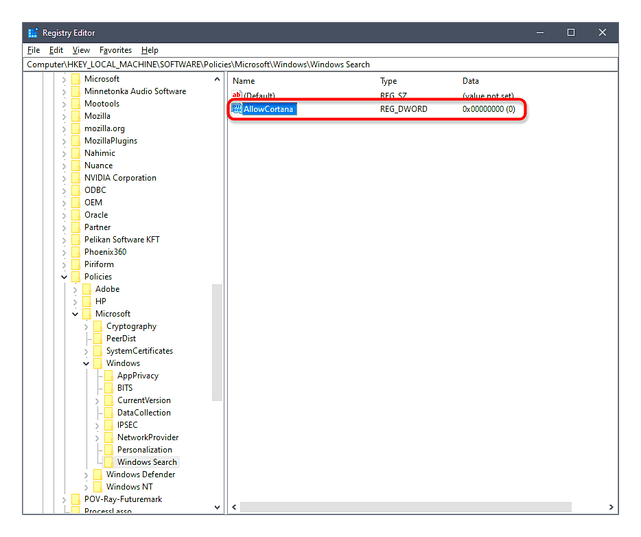 Назовите значение «AllowCortana». Дважды щелкните по нему и установите значение 0.