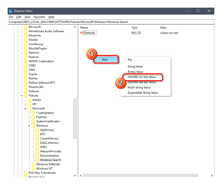Щелкните правой кнопкой мыши ключ поиска Windows (папку) на левой панели и выберите New> DWORD value (32-bit).