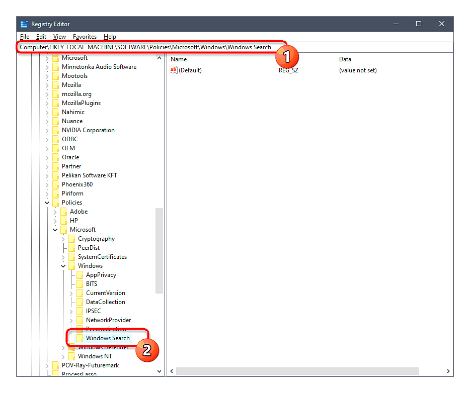- Прокрутите до следующей клавиши на левой боковой панели: HKEY_LOCAL_MACHINE \ SOFTWARE \ Политики \ Microsoft \ Windows \ Поиск в Windows
