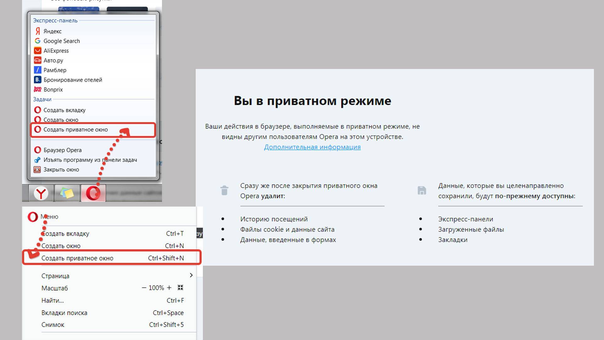Для моментального переключения в Opera используйте сочетание клавиш «Ctrl+Shift+N». Включить приватный режим вручную вам помогут следующие действия.