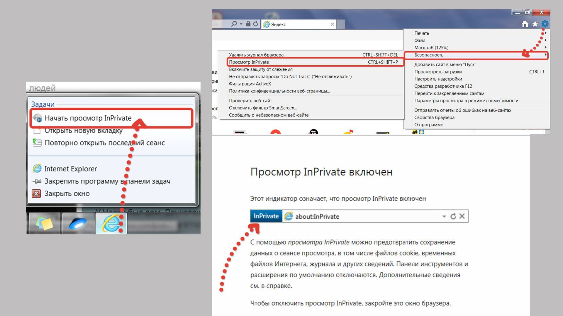 В Internet Explorer приватность включается через параметр «Безопасность»