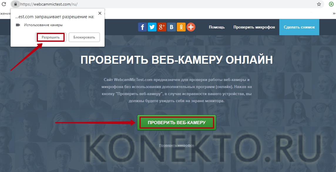 Узнать, действительно ли камера включена, позволяют специальные онлайн-сервисы. Один из наиболее простых и удобных — WebcamMic Test. Для проверки видеокамеры пользователю необходимо: