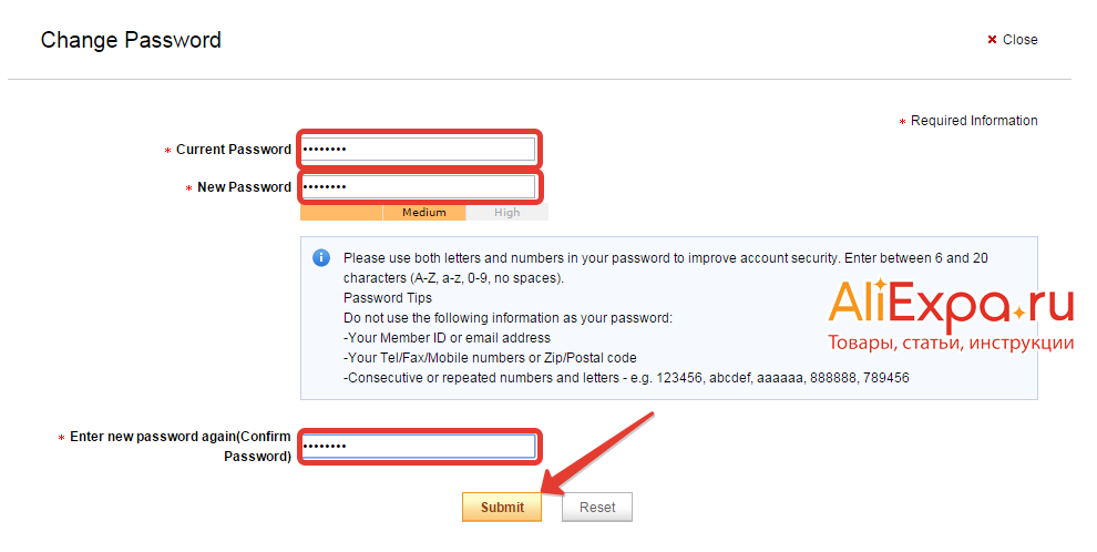 Придумываем пароль для сайта Aliexpress
