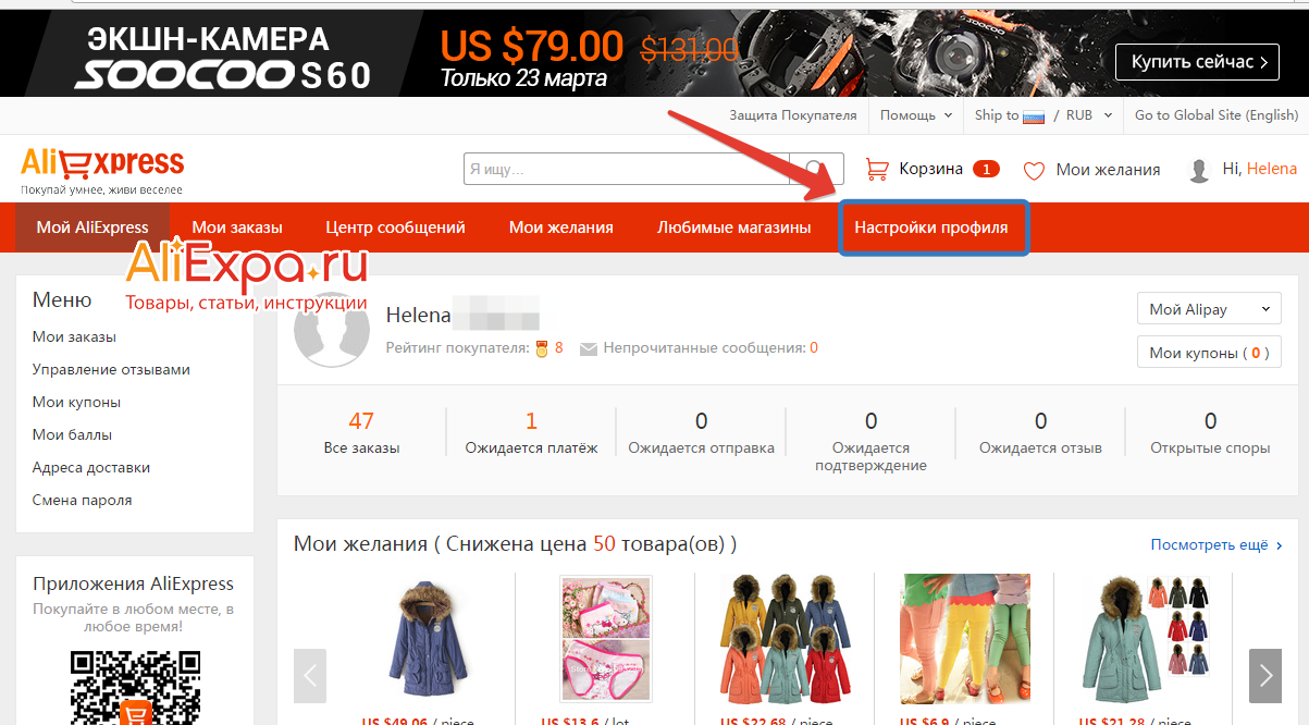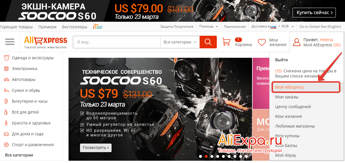 1. Заходим на сайт Алиэкспресс https://ru.aliexpress.com/, открываем раздел «Мой профиль» и выбираем «Войти».