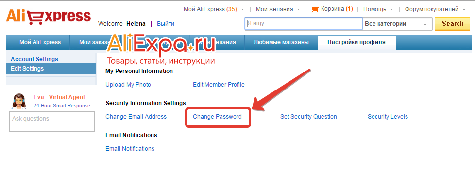 В новом открывшемся окне, Аliexpress перейдет на английский язык, но это не должно вызвать затруднений. Просто выбираем «Change Password» и продолжаем свои действия.