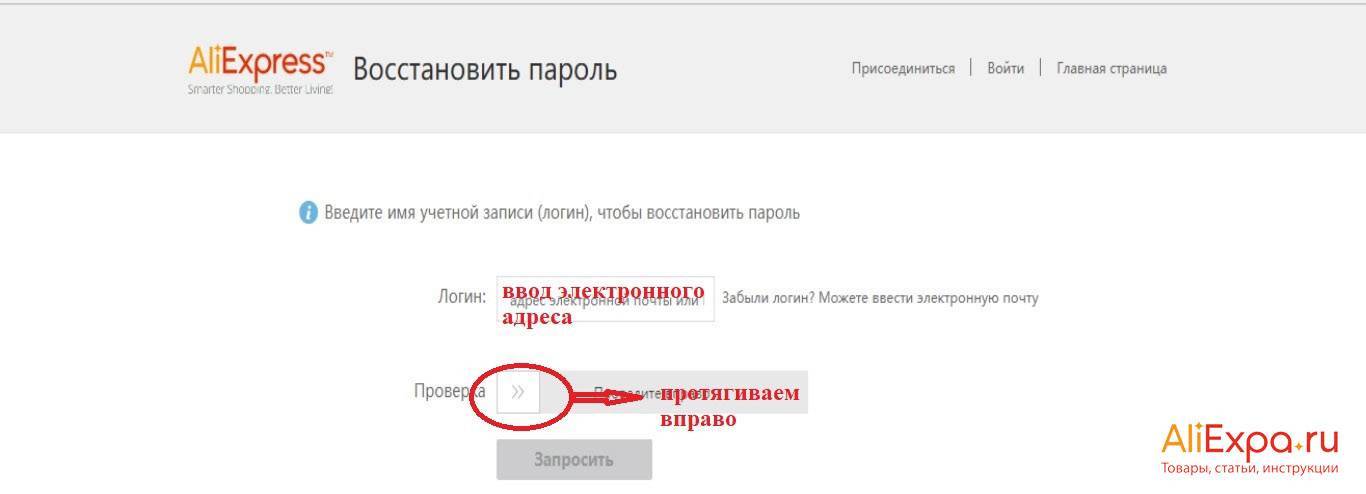 Откроется стандартная форма AliExpress для восстановления паролей. Здесь нужно будет ввести электронную почту, к которой прикреплен аккаунт, и пройти своеобразную капчу – провести вправо специальный слайдер. После этих процедур потребуется нажать кнопку «Запросить».</li>