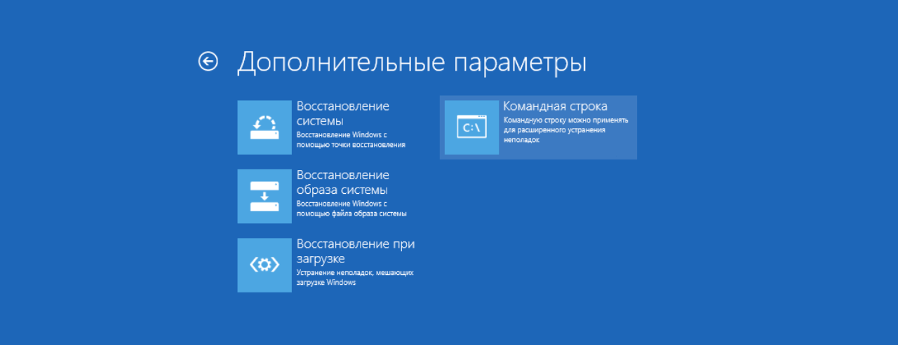 Итак у вас есть диск восстановления. Необходимо загрузиться с него и выбрать одну из предлагаемых раскладок клавиатуры. После этого следуйте по пути «Диагностика» – «Дополнительные параметры» – «Командная строка» (прямой ссылки на загрузку системы в безопасном режиме вы не увидите).