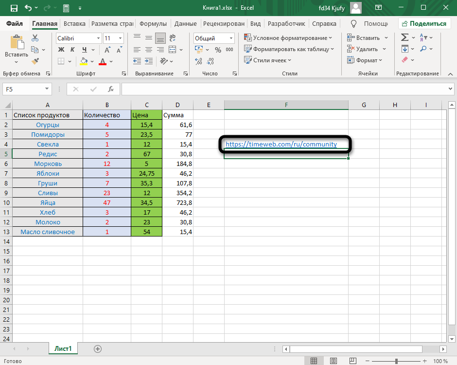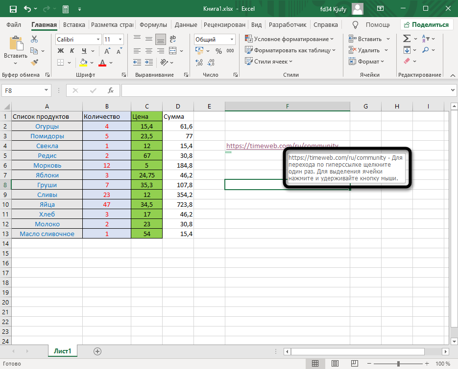 Гиперссылку в Excel легко заметить, она выглядит как подчеркнутый текст, выделенный синим цветом: