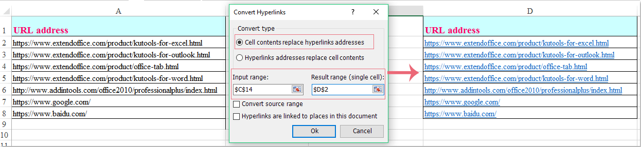 Наконечник: Если вы хотите сохранить простой текст после преобразования, вы можете снять флажок Преобразовать исходный диапазон в Преобразовать гиперссылку и выберите ячейку для вывода преобразованных результатов.
