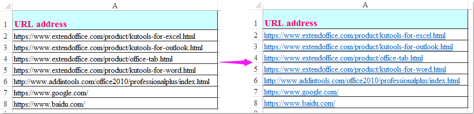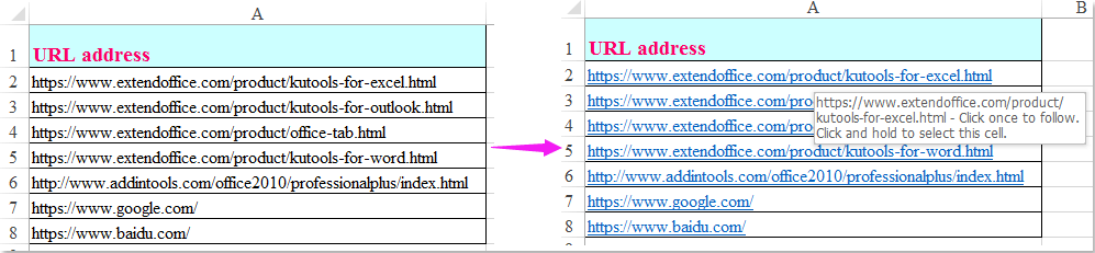 Преобразование кучи текстовых URL-адресов в активные гиперссылки Kutools for Excel