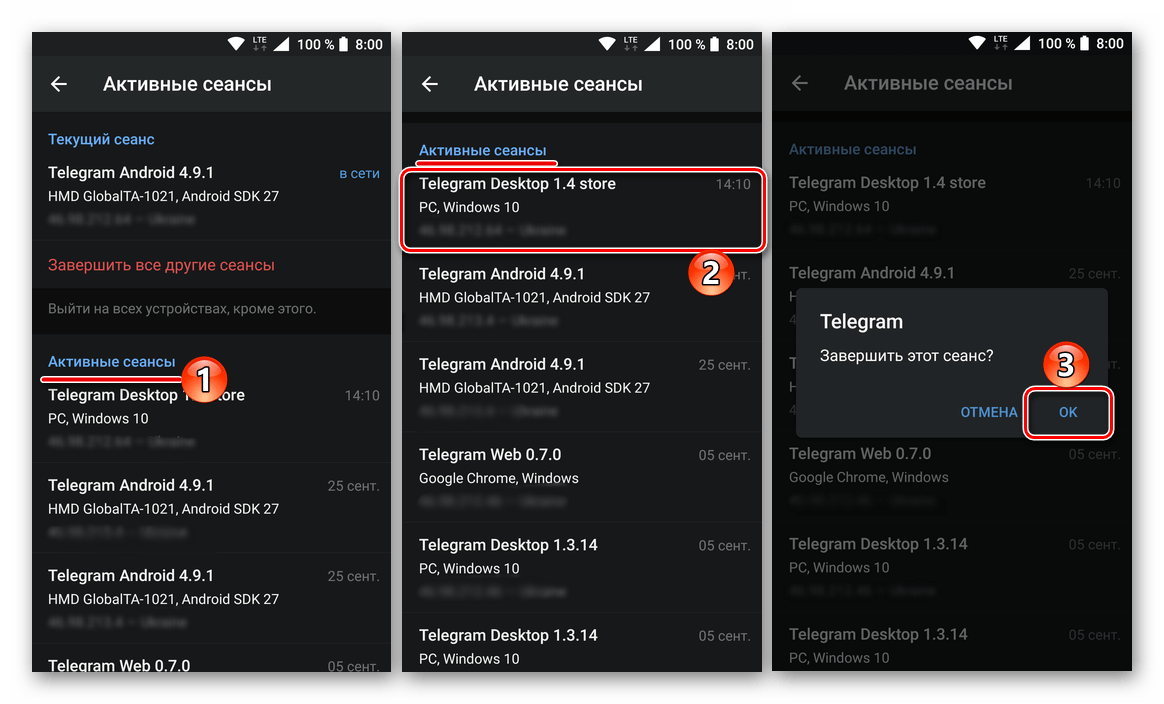 вы можете видеть все те устройства, н которых в последнее время использовался мессенджер, а также непосредственную дату входа в аккаунт на каждом из них. Для завершения отдельного сеанса просто тапните по его названию и нажмите «ОК»