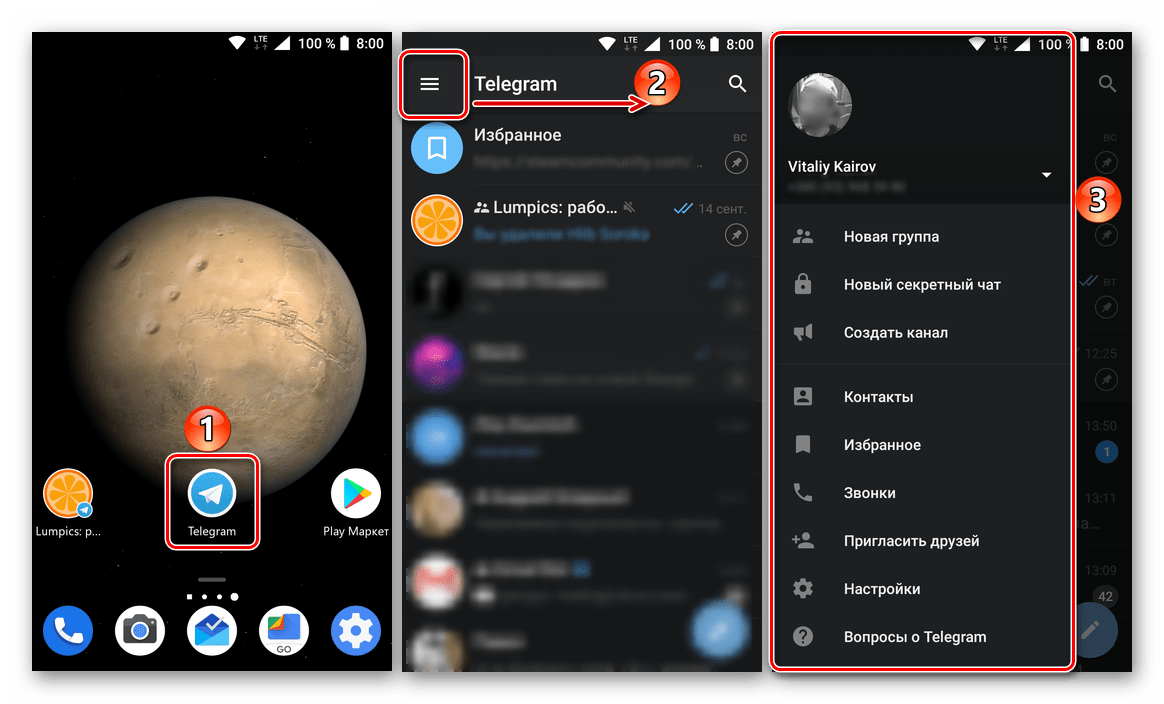 - Запустив клиент Telegram, откройте его меню: тапните по трем горизонтальным полосам в левом верхнем углу или просто проведите пальцем вдоль экрана, слева направо.