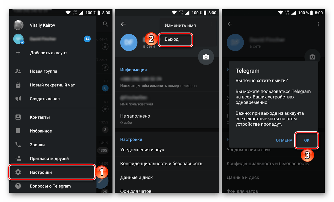 Через телефон с операционной системой Android выйти из аккаунта Telegram сразу на всех устройствах можно следующим образом:
