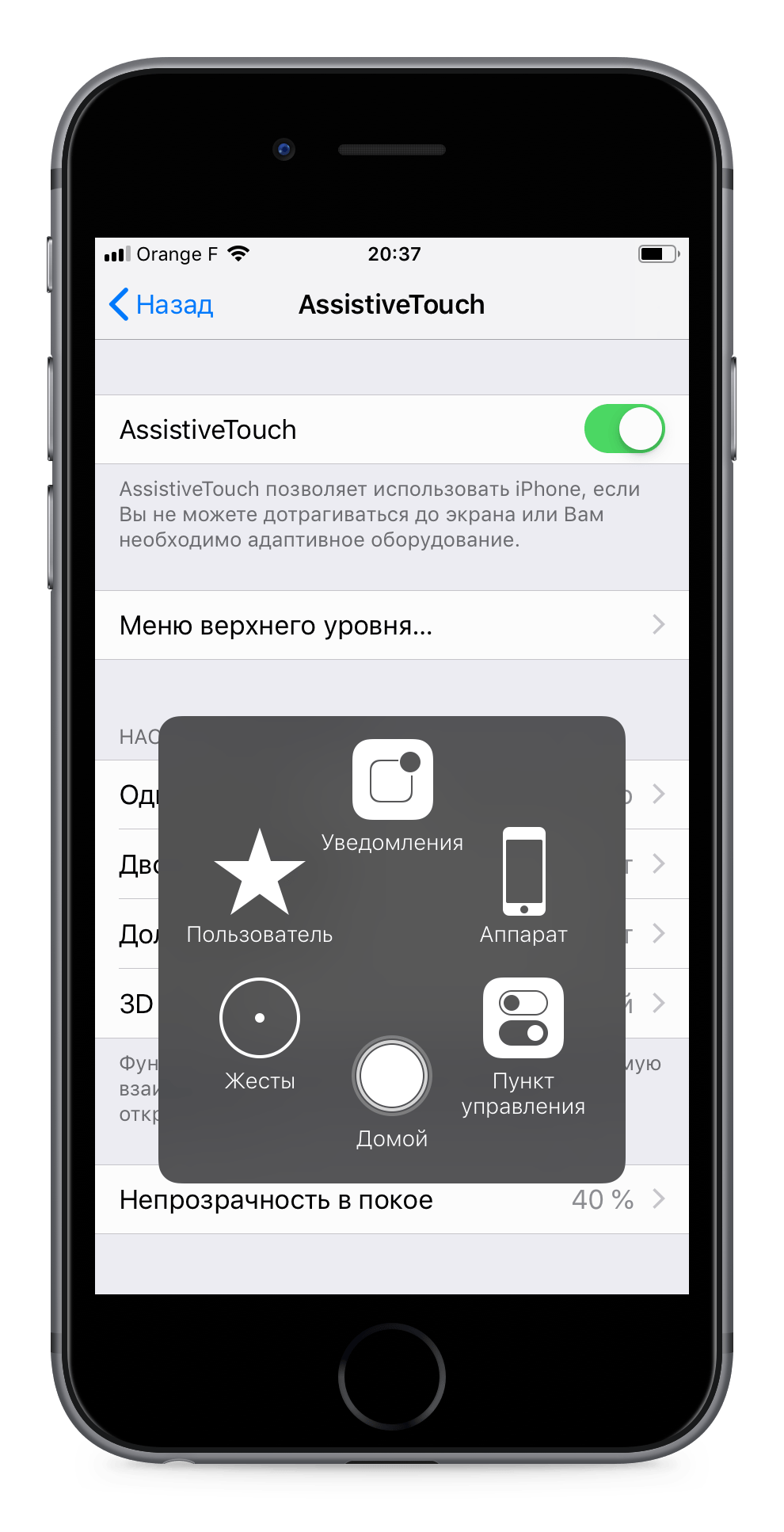 При помощи меню AssistiveTouch можно создать виртуальную кнопку для перезагрузки смартфона.