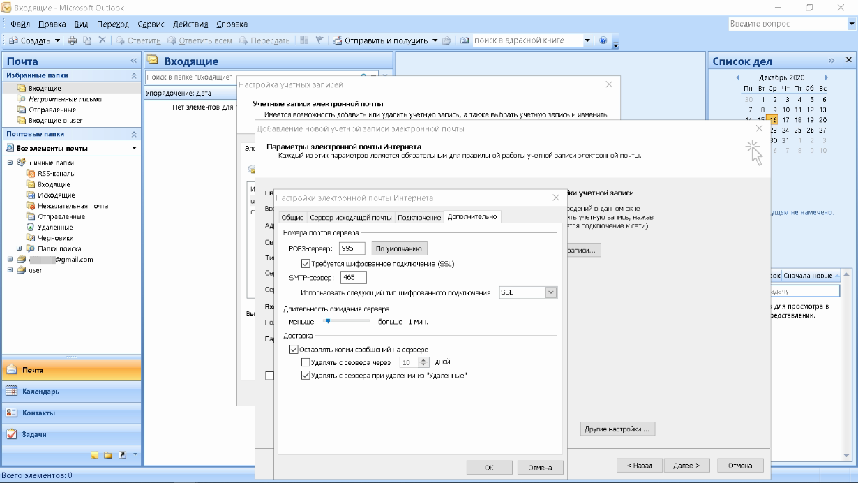 Для лучшей защиты данных, которые вы отправляете и получаете при помощи почтовой программы, необходимо включить шифрование. Для этого на вкладке «Дополнительно» установите галочку напротив «Требуется шифрованное подключение (SSL)». Если вы хотите оставлять на сервере письма, скачанные почтовой программой, отметьте вариант «Оставлять копии сообщений на сервере», выберите период хранения и удаления.