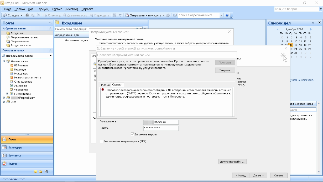 Проводим проверку учетной записи и обнаруживаем проблему отправки тестового электронного сообщения.