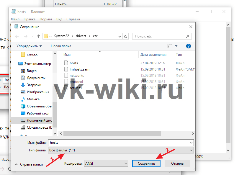 После этого нужно сохранить получившийся файл, выбрав в «Типе файла» пункт «Все файлы». Название файла при этом менять не требуется. Если все было сделано правильно, то после всех этих манипуляций зайти во «ВКонтакте» просто не получится. Когда потребуется вернуть доступ к ресурсу обратно, нужно будет просто снова отредактировать файл hosts, убрав оттуда нижние добавленные строки.