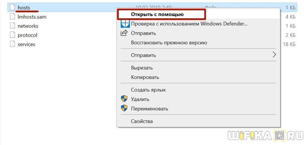 И находим файл «hosts». Для того, чтобы его открыть, кликаем по названию правой кнопкой мыши и заходим в раздел «Открыть с помощью»