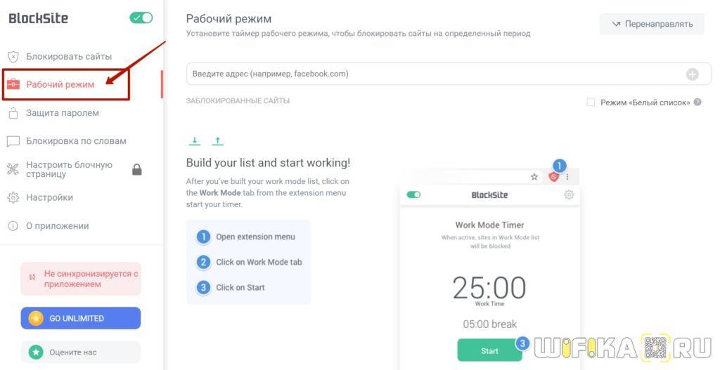 И еще один режим — «Рабочий», который позволяет установить расписание по времени, в какие именно дни и часы будет осуществляться блокировка доступа к выбранным сайтам в браузере.