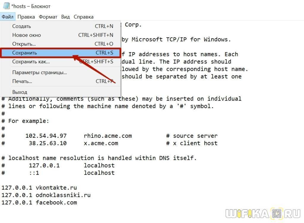 127.0.0.1 — это локальный IP адрес в системе Windows, который выдает ошибку о недоступности сайта для просмотра. После него через пробел идеи адрес сайта, типа «vk.com», «ok.ru», «fb.com» и так далее. Каждый отдельный сайт пишем с новой строки