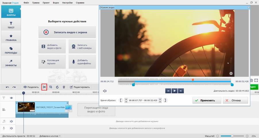 Помимо функции записи «Экранная камера» оснащена модулем постобработки созданных роликов. При помощи специального редактора клип можно обрезать, озвучить музыкой из встроенной коллекции (или же со своего ПК) и украсить готовыми заставками.