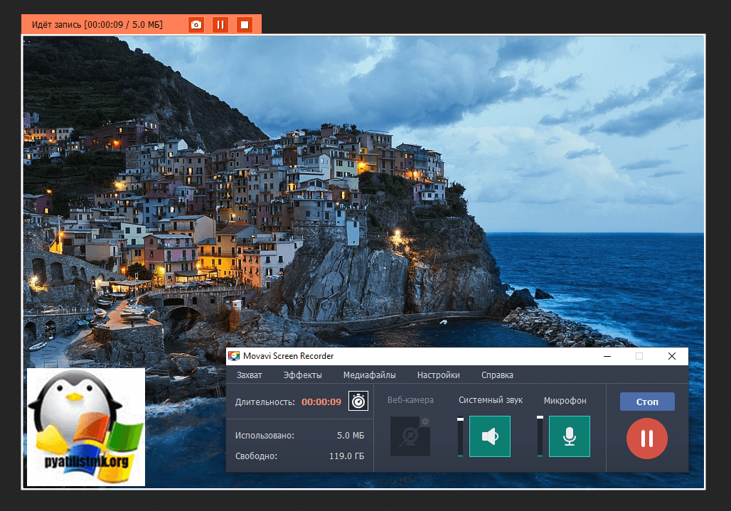 В свою очередь, когда запись уже идёт, на панели в этот момент отображаются кнопки для отмены, паузы и остановки. Слева можно увидеть объём данных, используемый для хранения текущего отснятого материала, а также общий объём свободного места на логическом разделе диска, куда идёт запись: