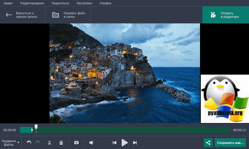 Когда видео будет записано, откроется окно предпросмотра. Здесь вы избавитесь ото всех лишних фрагментов: отметьте “ножницами” границы, а затем удалите клипы. Кстати говоря, тут тоже можно сделать скриншот, но уже без дополнительных элементов.